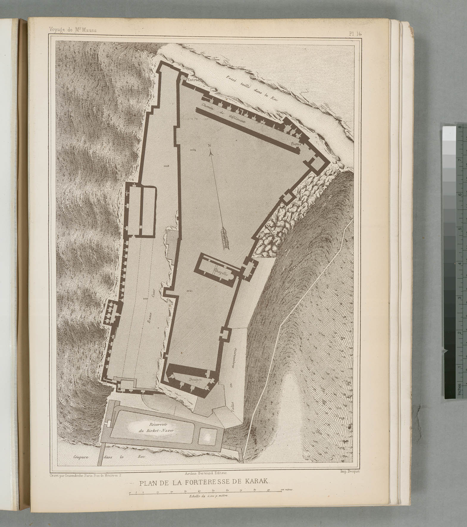 16 avril. La forteresse, qu’un large fossé isole de la ville, du côté nord, est défendue, au sud, par un immense réservoir d’eau, fortifié lui-même autrefois, et par un fossé de plus de 30 mètres de large taillé dans le rocher et isolant tout le système de défense de la partie sud de la colline sur laquelle est assise la place de Kerak.
