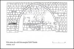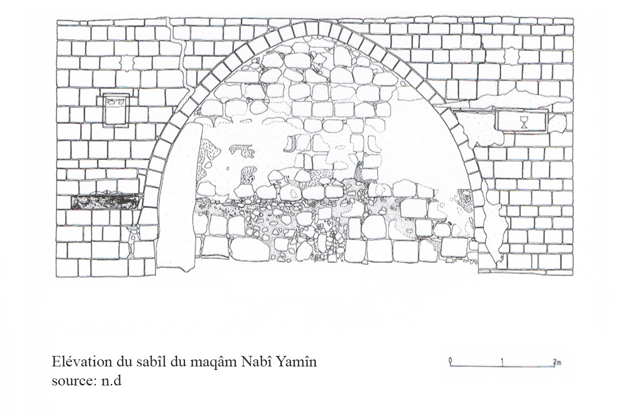 Une fontaine publique (sabîl) située au nord, elle consiste en une grande arche (6m de large) avec deux petits dômes aux extrémités, on trouve un petit accès sur le côté gauche. A droite une inscription de fondation datée 740/1340 et portant un blason (une coupe) attribué au gouverneur de Damas Saif al-Dîn Tankiz (ill.10-13), cette inscription semble plutôt se référer au khân Jaljulîya construit par ce même Tankiz.[1]