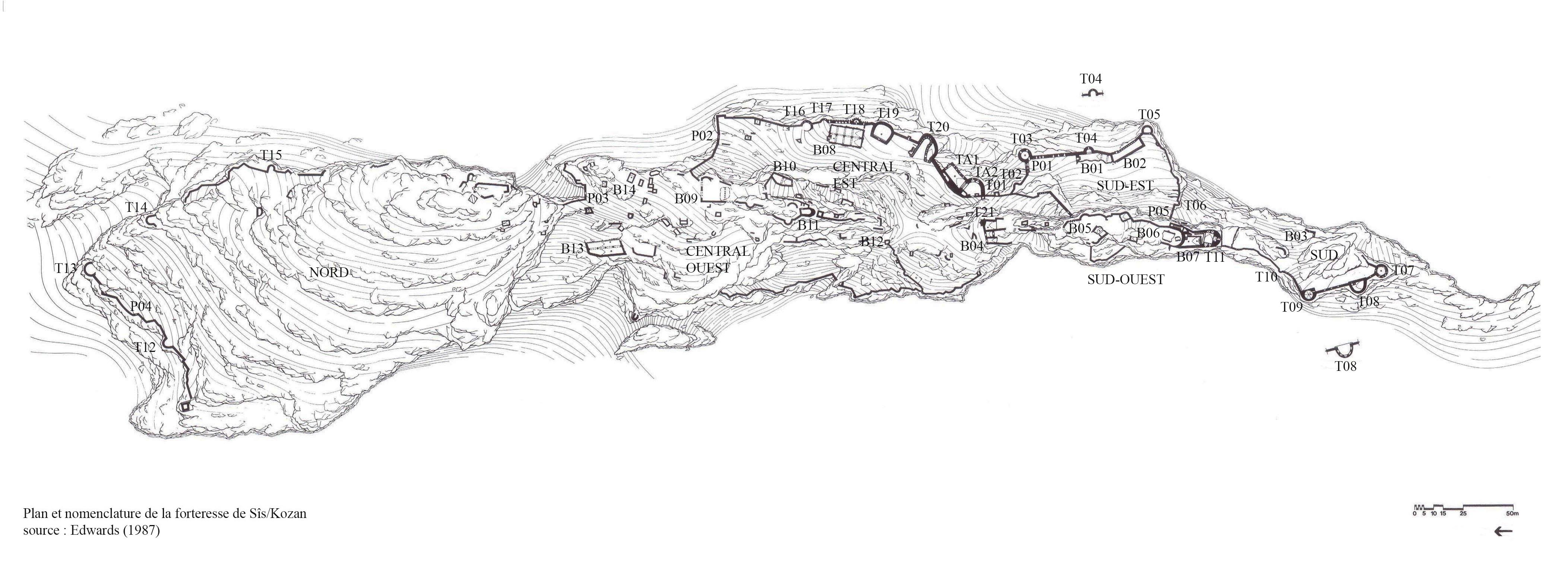 « De bonnes murailles, aujourd’hui ruinées, entouraient Sîs. Un château fort, construit sur le roc à pic qui la domine, est l’œuvre du Thakavor Héthum, ce que démontre un fragment d’inscription arménienne que j’ai lu dans l’intérieur de la grande tour. »
