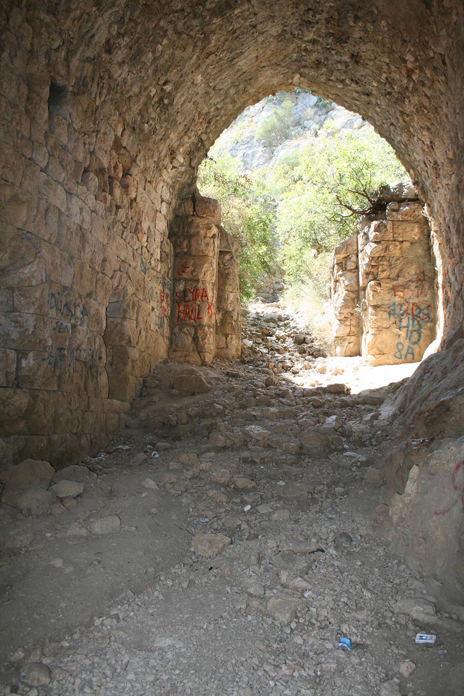 Dans l’intérieur de chacune des trois parties de la forteresse, on remarque encore les restes de constructions secondaires, telles que prisons creusées dans le roc, magasins, casernes, etc.