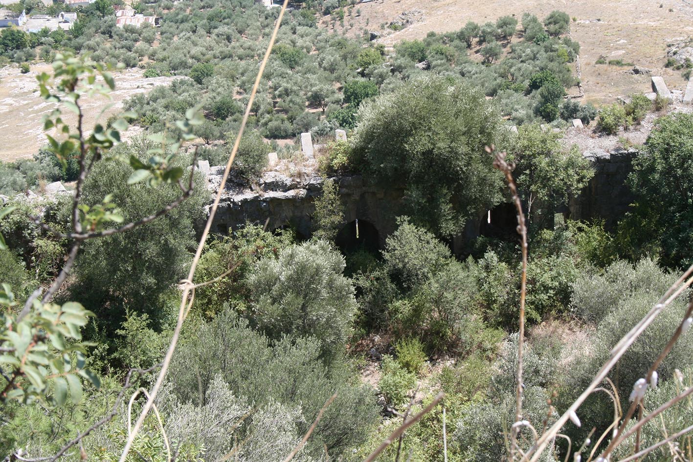 En suivant l’étroit sentier qui conduit de l’enceinte des fortifications de ce dernier pic à celles assises sur le troisième, on trouve un petit réservoir d’une eau excellente qui, dit-on, reste toujours au même niveau, et à laquelle les Arméniens attribuent la vertu de guérir beaucoup de maladies. En poursuivant sa marche dans la même direction, sans s’écarter du sentier qui lie le deuxième pic au troisième, on arrive à une grotte, désignée par les habitants sous le nom de Guerchinlik (lieu des colombes) ; c’est une caverne sombre, humide et du plus triste aspect, où suinte une eau épaisse qui, pendant l’hiver, se convertit en stalactites que les premières chaleurs de l’été font disparaître. On ne voit point de colombes sur ce point, qui d’ailleurs ne présente rien qui puisse les y attirer.