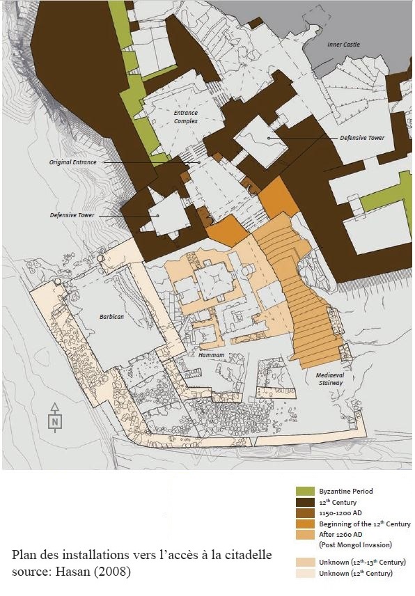 L’invasion des troupes Mongoles en 658/1260 cause d’importants dégâts sur la citadelle ; le mur d’accès, le front nord-ouest du donjon et la partie haute du mur extérieur se sont effondrés.