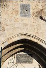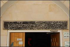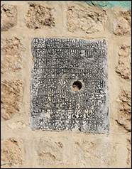 A côté s'élève une tour carrée, qui sert aujourd'hui de minaret. Elle m'a paru construite avec des matériaux un peu plus petits que l'église elle-même, mais également très-réguliers. Si cette tour a été primitivement un clocher, on ne voit pas trop, dans l'état actuel, la place qu'occupaient les cloches; cette place néanmoins a pu être murée. La porte par laquelle on entre maintenant regarde le nord. Au dessus a été gravée une inscription arahe, dont voici la traduction, telle que M. Sauvaire, alors chancellier de M. le consul de France à Jérusalem, a eu la honte de mêla donner :