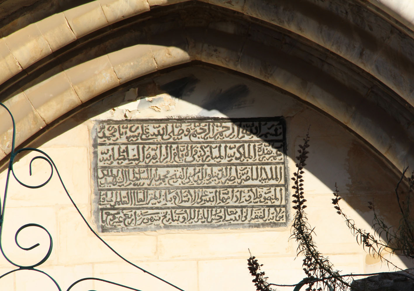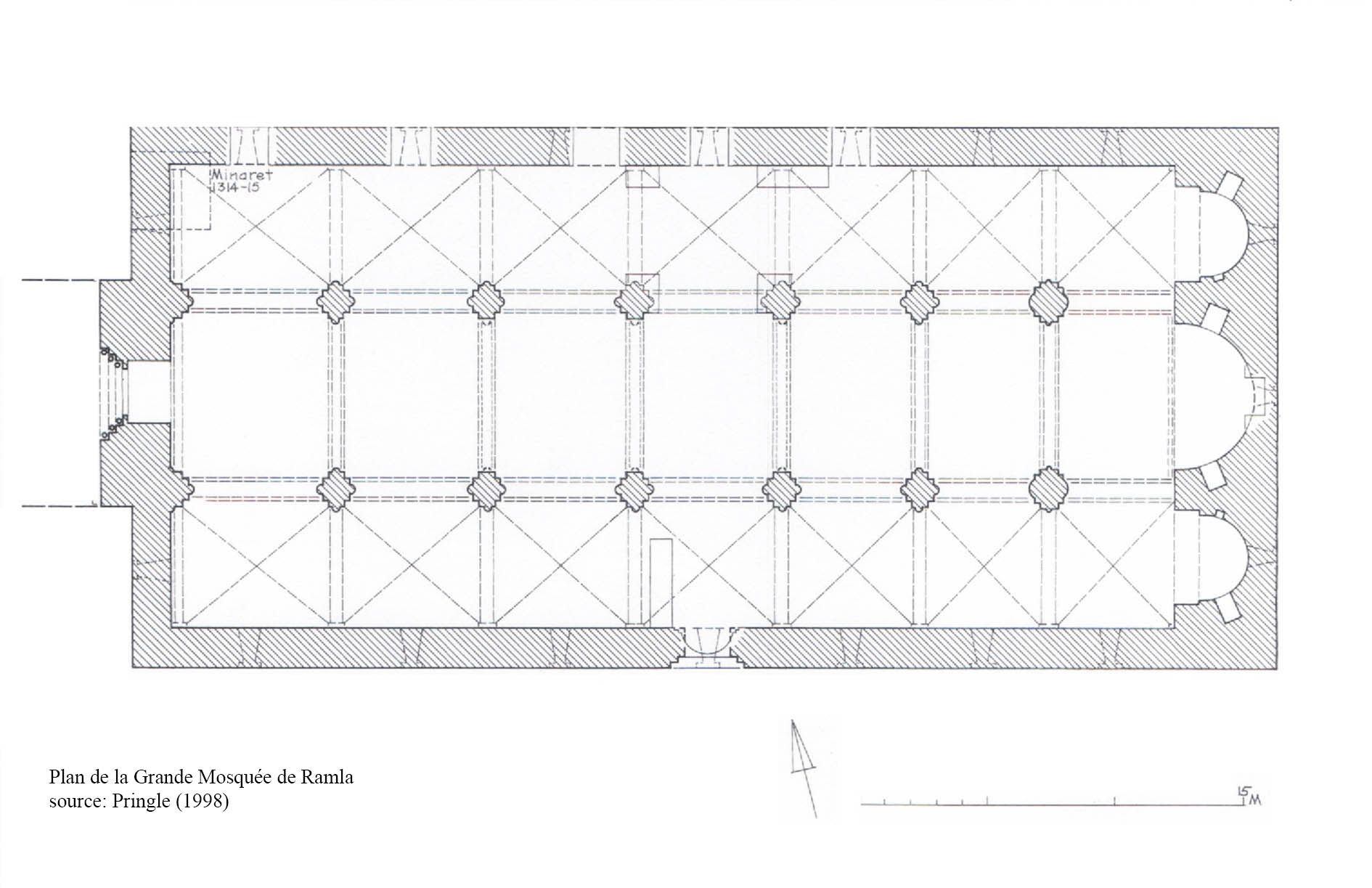 L’église des Croisés[1] a été transformé en mosquée pour le compte du sultan al-‘Adîl Kitbugha en 696/1296, (avant qu’il ne renonce au trône le 27 muharram 696/25.XI.1296). Cette transformation, datée par l’inscription à l’est, est réalisée sous la conduite de ‘Ali ibn Khalîl (ill.12). Un minaret est ajouté en 714/1314-1315, sous le règne du sultan al-Nâsir Muhammad (30 ramadan 709/3.III.1310 - 21 dhu’l-hijja 741/7.VI.1341), par le gouverneur de la province de Gaza Sanjâr al-Jawlî (1e mandat de dhu’l-hijja 712/avril 1313 au 28 sha’ban 720/3.X.1320).[2] Les travaux sont confiés à Hasan ibn Ilyas al-Salawî. Le minaret actuel, de forme cylindrique, n’est pas d’origine (ill.3).[3] L’ancienne entrée au sud est bouchée (ill.8) et un mihrâb a été creusé dans le mur, l’accès se faisait dorénavant par le nord (ill.13).