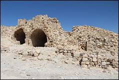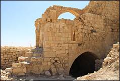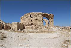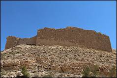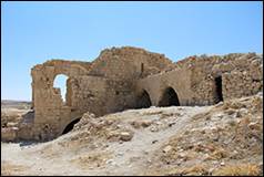( الشوق كر) perhaps the ancient Carcaria, is the principal place in Djebel Shera ; it is situated about one hour to the south of the Ghoeyr, upon the top of a hill in the midst of low mountains, which bears some resemblance to Kerek, but is better adapted for a fortress, as it is not commanded by any higher mountains. At the foot of the hill are two springs, surrounded by gardens and olive plantations. The castle is of Saracen construction, and is one of the largest to the south of Damascus ; but it is not so solidly built as the castle of Kerek. The greater part of the wall and several of the bastions and towers are still entire. The ruins of a well built vaulted church are now transformed into a public inn or Medhafe. Upon the architraves of several gates I saw mystical symbols, belonging to the ecclesiastical architecture of the lower empire. In several Arabic inscriptions I distinguished the name of Melek el Dhaher. Where the hill does not consist of precipitous rock, the surface of the slope is covered with a pavement. Within the area of the castle a party of about one hundred families of the Arabs Mellahein (ملاحين ) have built their houses or pitched their tents. They cultivate the neighbouring grounds, under the protection of the Howeytat, to whom they pay tribute. The horsemen of the latter who happen to encamp near the castle, call regularly every morning at one of the Medhafes of Shobak, in order to have their mares fed ; if the barley is refused, they next day kill one of the sheep belonging to the town.
