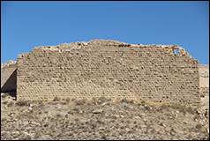 à la face ouest du burdj carré que nous voyons du camp, régnent des portions notables d'un grand mur de soutènement adossé au revers opposé du ravin et s'étendant sur une longueur d'environ 120 à 130 mètres. J'avais d'abord pris ce mur pour celui d'une ancienne piscine; mais nous apprîmes bientôt que la tradition du pays fait de cet endroit l'emplacement d'un ancien bazar. Cela me paraît difficile à expliquer, car ce bazar aurait ainsi été tout a fait en dehors de la ville et situé au pied même du rocher de Chaubak […]