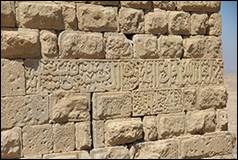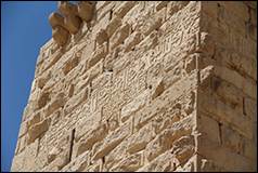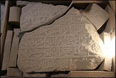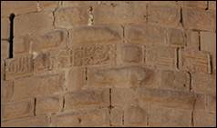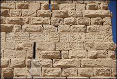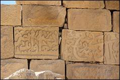 ca.676/1277. Texte de construction, 3 fragments : A sur une tour semi-circulaire, B sur une tour carrée, C au-dessus d’une porte de maison, réassemblés en bandeau sur la tour T06 (inscription n°3 sur plan, ill.2, 14, 15, 56-58).[15]