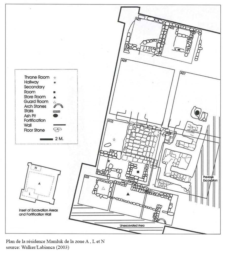 Zone L[10] : directement au sud de la zone A, un édifice identifié comme la résidence du gouverneur local comprenant une cour pavée, deux salles au nord, une salle à iwan à l’ouest, une salle au sol réhaussé de 50cm au sud ainsi qu’un accès vers un escalier. Le tout semblait couvert par des voûtes en berceau. Le côté est de la cour est occupé par le hammam qui fait face à la salle à iwan (la salle d’audience). On retrouve ce type de résidence palatiale dans les châteaux de Kerak et Shawbak notamment.[11]