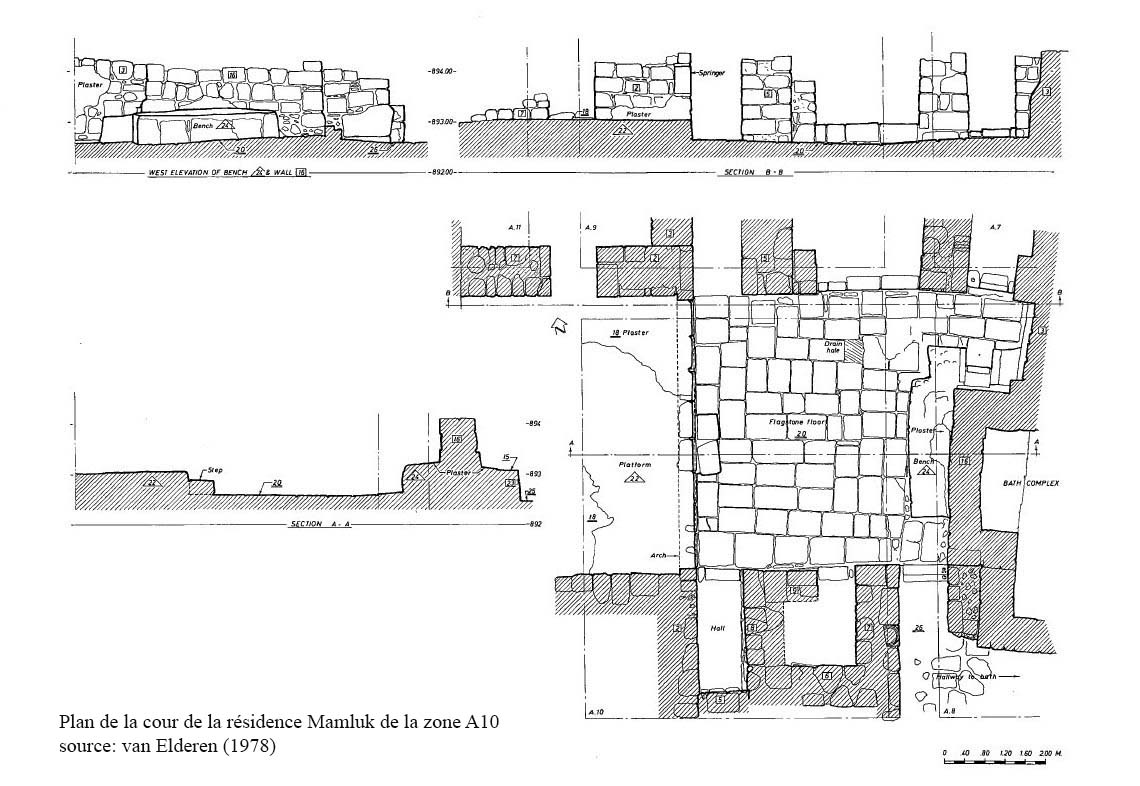 Zone P[16] : sur la pente sud-ouest et en contrebas, découverte d’une grande salle voûtée (9,6x6,2m) avec cour ceinte d’un mur, elle est datée de la période Mamluk avec extension et rénovation sous les Ottomans et au 19e siècle. Elle repose sur une structure Byzantine et Omeyyade (ill.67-72).