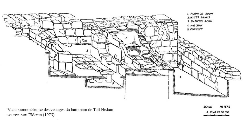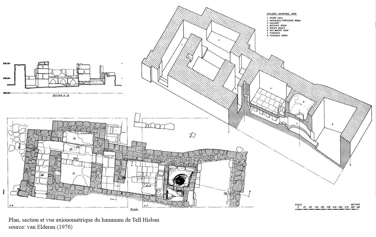 Le hammam a une taille relativement modeste (environ 14,5x5,5m), il présente toutes les salles d’un bain traditionnel et semble couvert par une voûte en berceau, les sols ainsi que le système de chauffe par hypocauste et les deux citernes (chaude et froide) sont conservés. Il n’y a pas de traces d’un circuit d’eau permettant de remplir les deux citernes du hammam se situant sur le point culminant du site. Ce hammam qui ne communique pas avec la résidence adjacente présente toutes les caractéristiques des bains Omeyyades qui équipent les dénommés ‘Châteaux du désert’, et de part ses modestes dimensions il semblerait être plutôt lié à la résidence du gouverneur que d’être dévolu au public (ill.1, 13-37, 42-44).