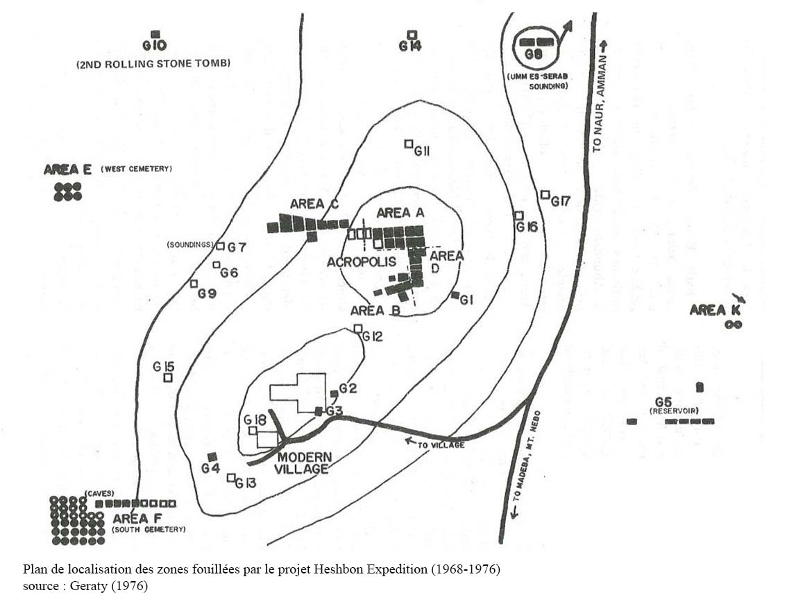 Heshbon Expedition 1968-1976 : principalement axée sur la connection du site avec la Bible[1], les fouilles se concentrent sur le sommet (zone A) et sur les pentes sud (zone B, D) et ouest (zone C). Les principaux édifices découverts sont : la Basilique byzantine, deux autres églises, un édifice monumental romain peut-être un Temple, les vestiges d’un complexe Mamluk, des tombes romaines (zone G), un réservoir de l’Age du Fer et des fortifications hellénistiques.