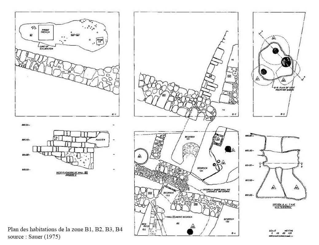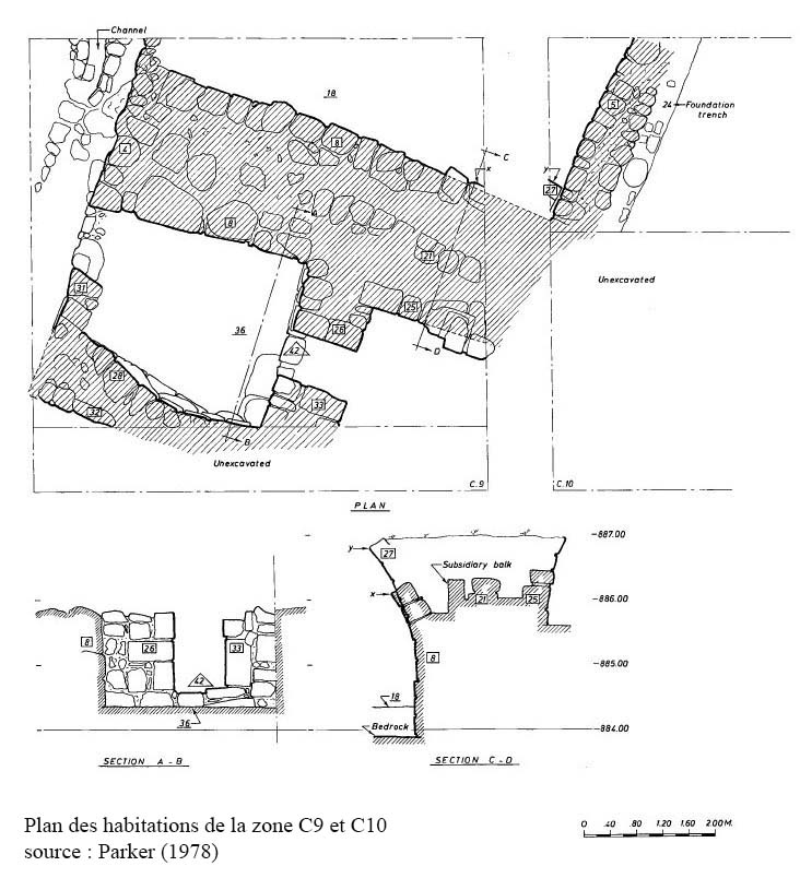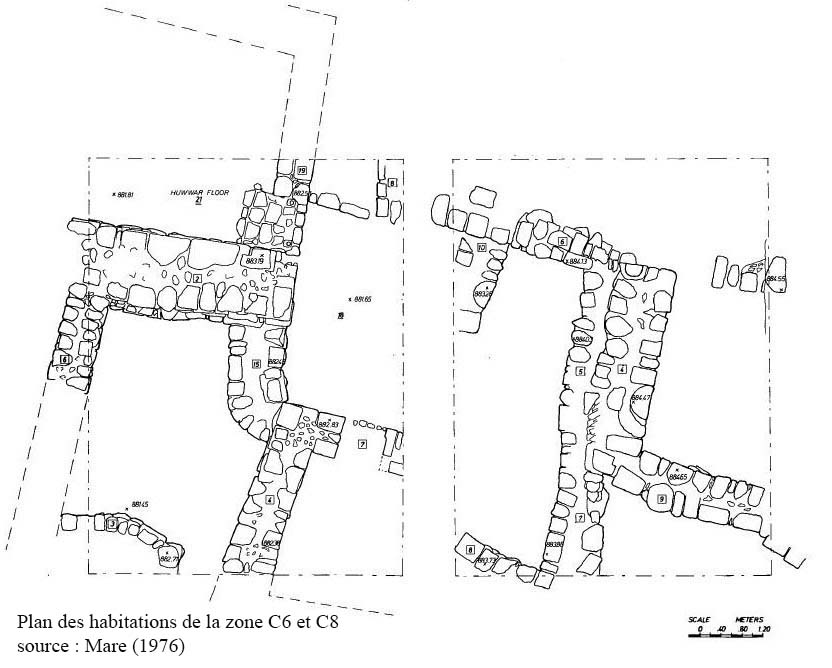 Les fouilles menées sur cette zone permettent de se faire une idée du plan général de ces structures : deux fermes composées d’une salle construites l’une contre l’autre avec un étroit espace de stockage voûté entre elles, elles partagent une cour, deux citernes et un espace cuisine. La fonction de l’annexe au nord n’est pas connue. Ces deux fermes fonctionnent comme deux unitées indépendantes et ne communiquent pas entre elles (ill.62-66).