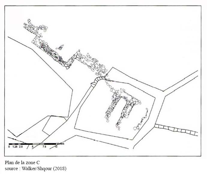 Zone C[6] : sur la pente ouest face au wadî Majar, c’est l’emplacement d’un village Mamluk en partie fouillé dans les années 1970. Il semble contenir un complexe s’étendant sur toute la pente à partir du mur ouest de la citadelle. Ces salles présentent la même architecture que les salles découvertes dans la zone M, elles reprennent aussi des éléments de remplois dont un système hydraulique et sont occupées jusqu’à la fin du 14e siècle, mais elles sont dévolues à un usage domestique. Deux structures en C4-C6 et C9-C10 sont bien préservées. Au nord, une ferme Mamluk reprend une construction byzantine et semble suivre la même architecture que les salles découvertes en zone M, elles s’ouvrent aussi sur une cour avec citerne, elles sont reconstruites au 14e siècle et seront réutilisées par les Ottomans. Des édifices de stockage sont aussi localisés à l’extrémité nord de la pente ouest (ill.49-51, 53-61).