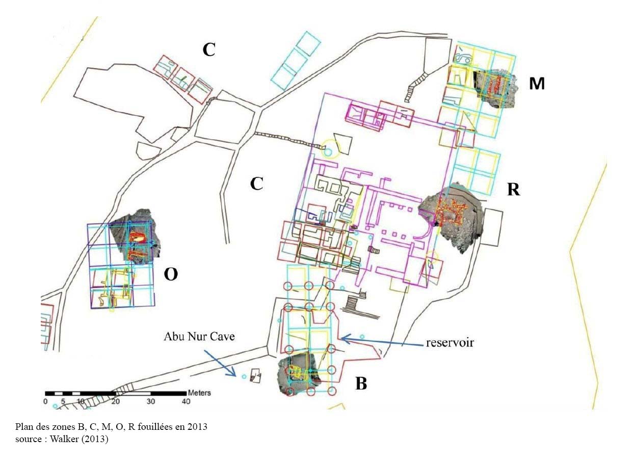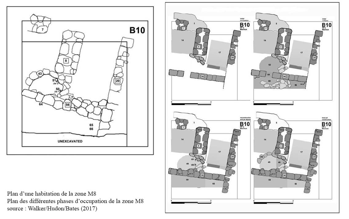 Zone M[13] : localisée sur la pente nord du tell près de la tour nord-est de la citadelle, on note une occupation non définie de la pente adjacente. Plus bas cette occupation apparaît plus dense avec des rangées de salles étroites couvertes d’une voûte en berceau aveugle avec un accès au nord, orientées perpendiculairement par rapport à la pente et sans communication entre elles, ces salles semblent reposer sur d’anciennes terrasses avec réutilisation d’un système hydraulique antérieur. Cet ensemble de salles, daté de la période Mamluk (dernière phase d’occupation avec interruptions), fonctionne comme élément de stockage, comme étables en relation avec la citadelle (M4, M5, M8) voire comme unités domestiques.