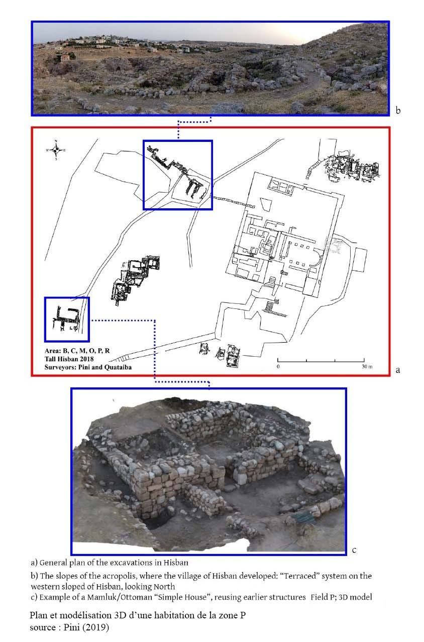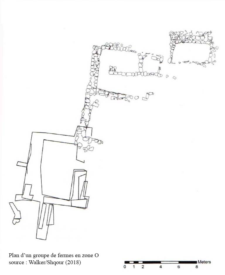 Zone O[15] : sur la pente sud-ouest et en contrebas, les fouilles ont révélées les mêmes constructions que précédemment dont une salle avec four (tannur), on note des modifications pendant la dernière phase d’occupation, notamment la séparation par un mur avec bac pour stocker le grain (qiwarah) à l’époque Ottomane. Un autre ensemble de constructions identiques, daté de la période Mamluk, est découvert en O9-O10 avec cours et citernes, cet ensemble est identifié comme une habitation construite sur des vestiges byzantins prouvant aussi une occupation de longue date du site (tout comme les habitats de la zone M). Les fouilles en 2014 ont exhumées une annexe à l’habitat.