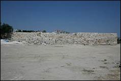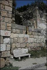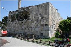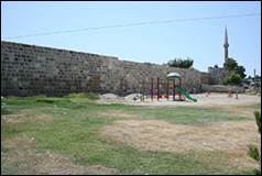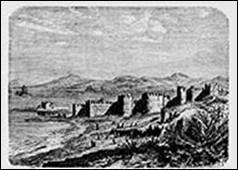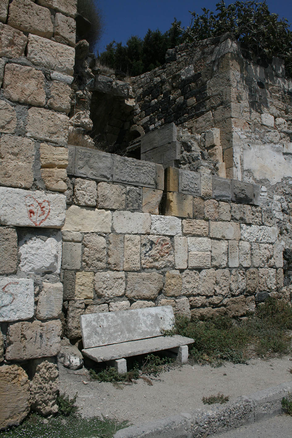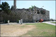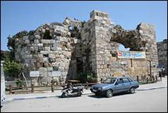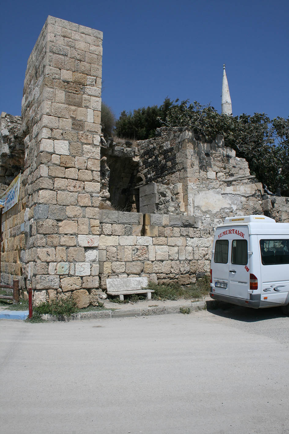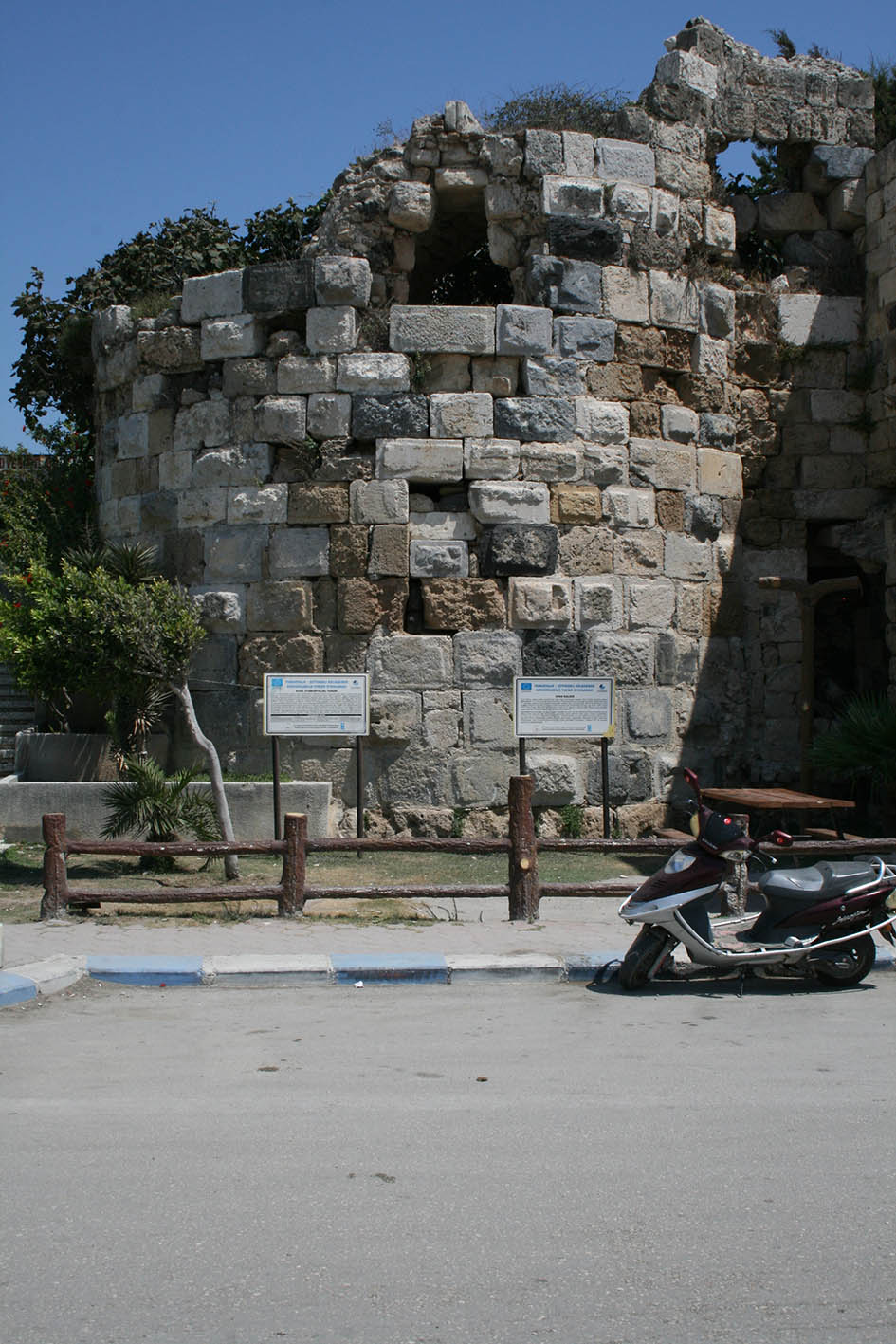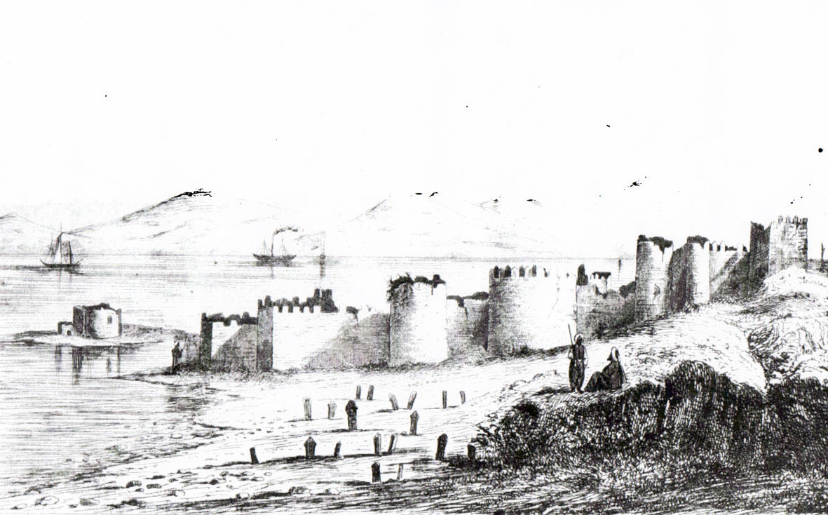 A l’extrémité occidentale des ruines de la ville, et presque sur le bord du rivage, se dresse une petite tour octogonale, élevée par Soliman avec des pierres provenant des décombres de la ville et tout à fait dans le même style que la restauration du château. La porte située au nord est surmontée d’une plaque de marbre noir sur laquelle on lit, gravée en creux, l’inscription arabe que voici :