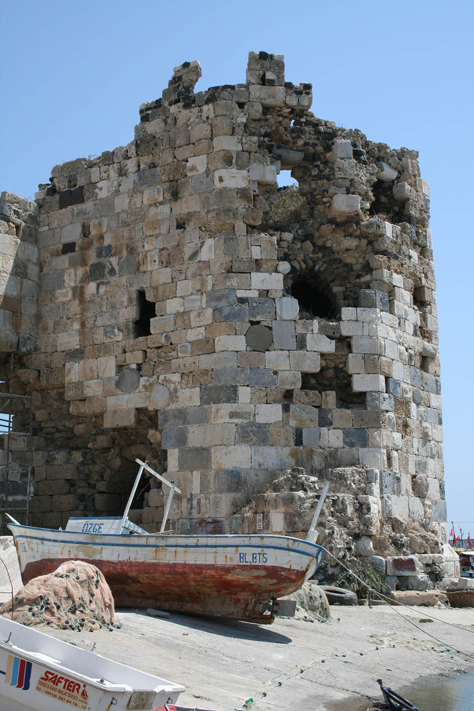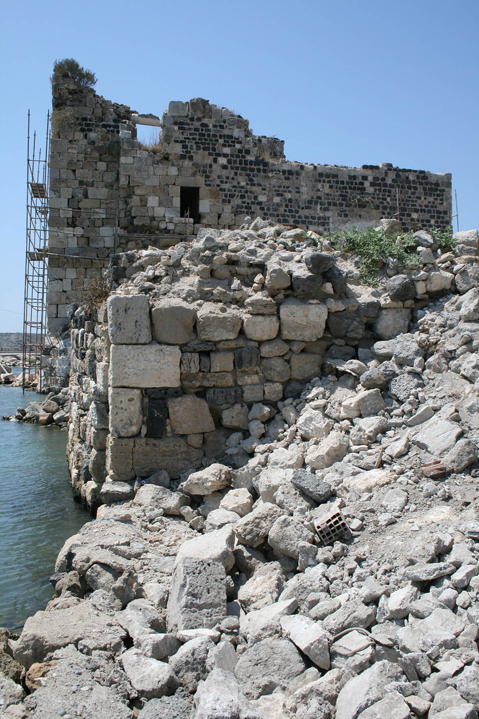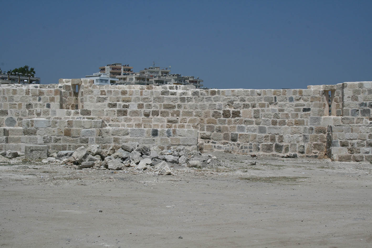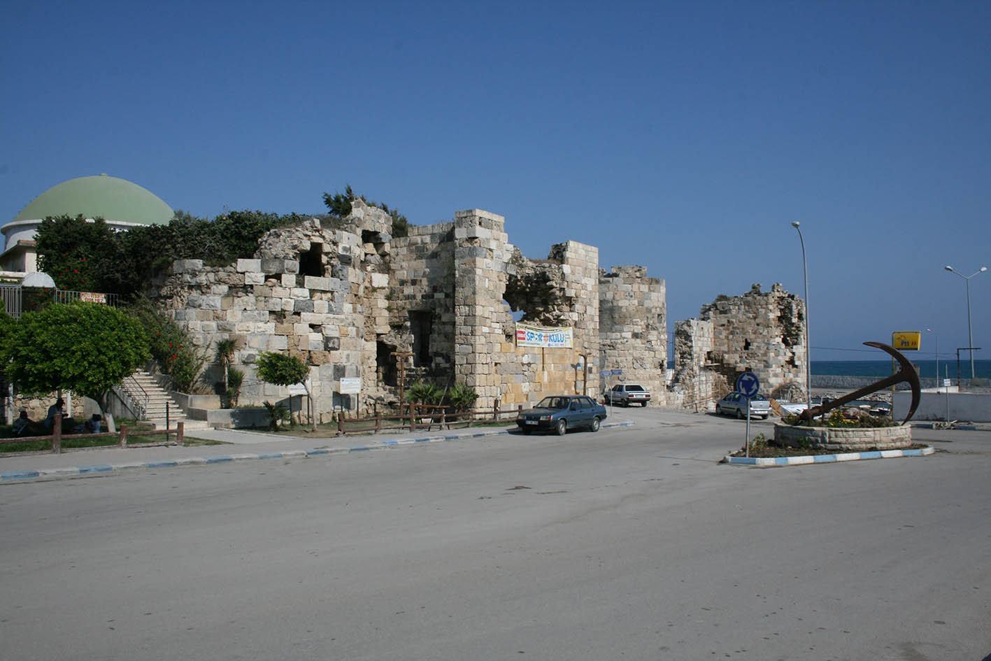 Le seul édifice que le temps ait respecté est le château et les appendices construits avec des pierres provenant des débris de la ville incendiée lors de la conquête. Ce château, qu’avait élevé les rois d’Arménie, a été bâti avec des pierres de taille entre lesquelles on a enchâssé symétriquement des fûts de colonnes provenant d’anciens édifices. Lors de la restauration de ce château par le sultan Soliman, qui avait compris de quelle importance était pour lui cette position avancée sur la côte de la Syrie, les ouvriers employèrent des pierres calcinées par le feu qu’ils ajustèrent de telle sorte dans les parties écroulées de l’édifice, qu’il semble affecter la figure d’un échiquier. Cette construction se compose de deux enceinte et d’un fossé. L’enceinte intérieure est la plus élevée ; elle est formée de murailles reliées par des tours rondes ; l’autre est en partie ruinée, et, dans plusieurs endroits, il n’en reste que les fondations. C’est sur la première de ces murailles que j’ai vu encastrées deux inscriptions grecques mutilées de l’époque romaine. Au pied de ce château et du côté de la mer, on voit quantité d’énormes boulets de pierre, provenant du dernier siège que la ville eut à soutenir contre les musulmans.