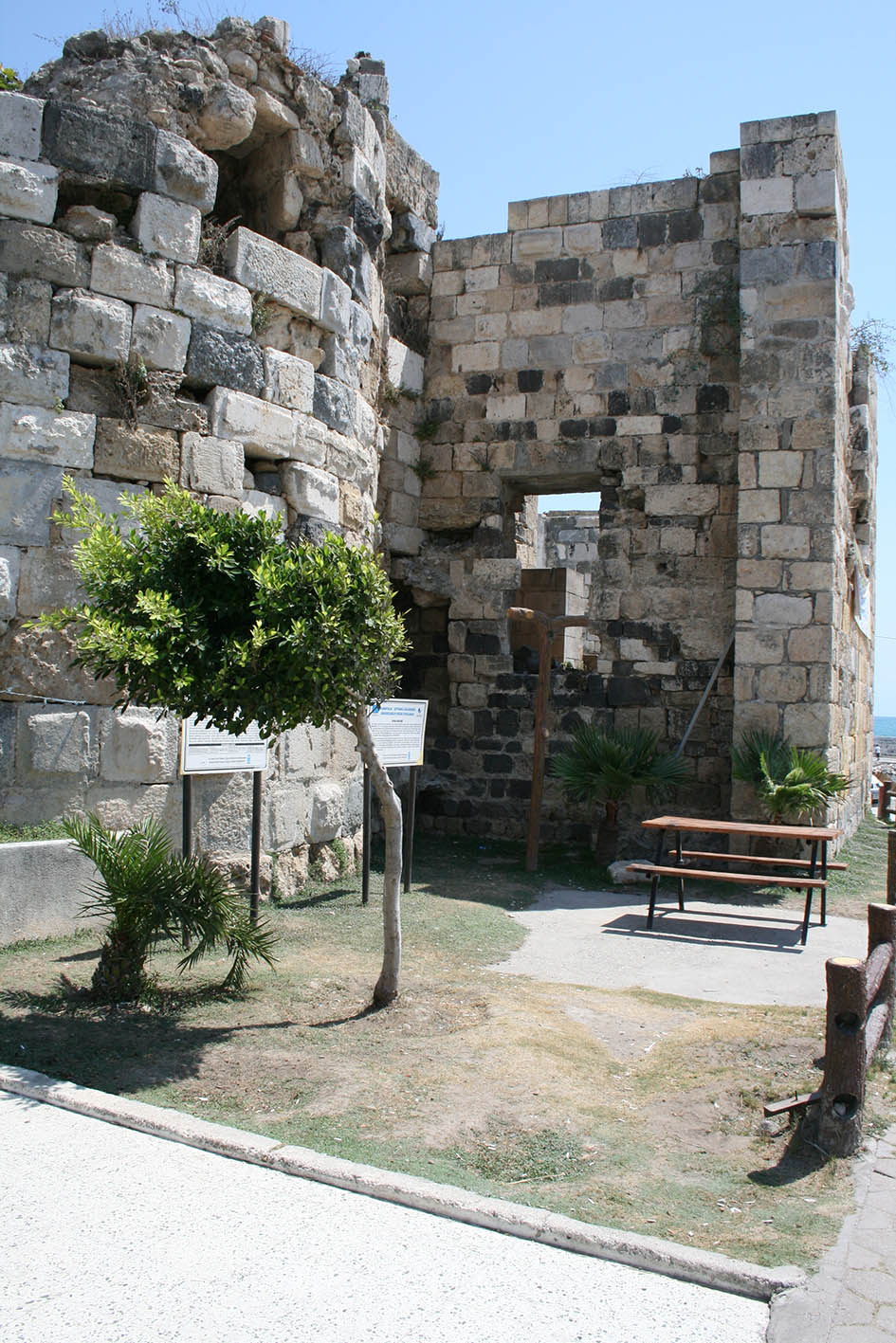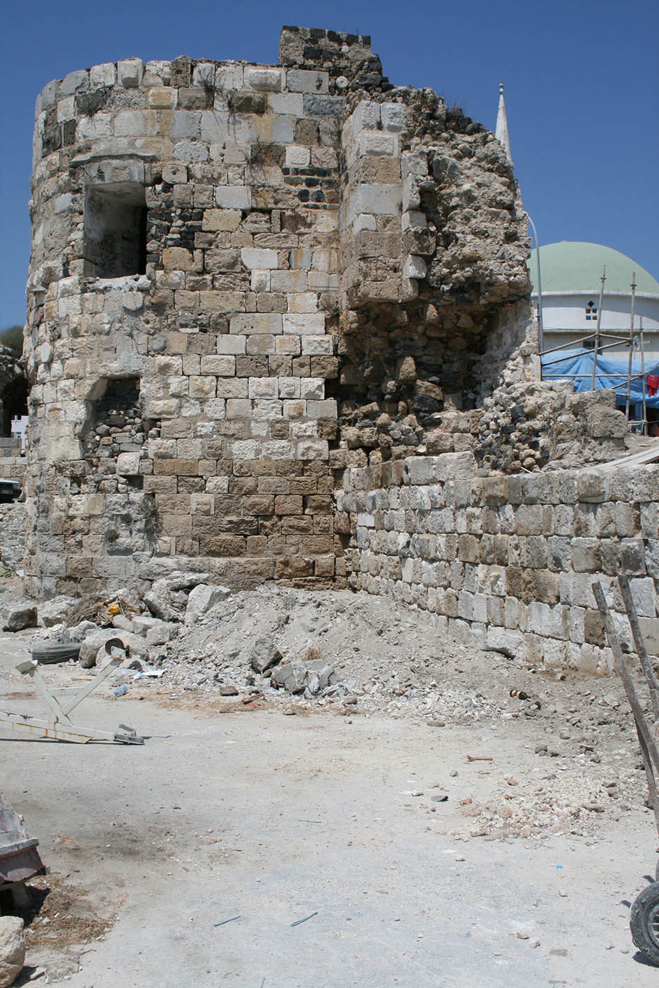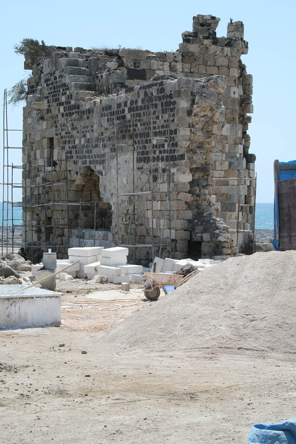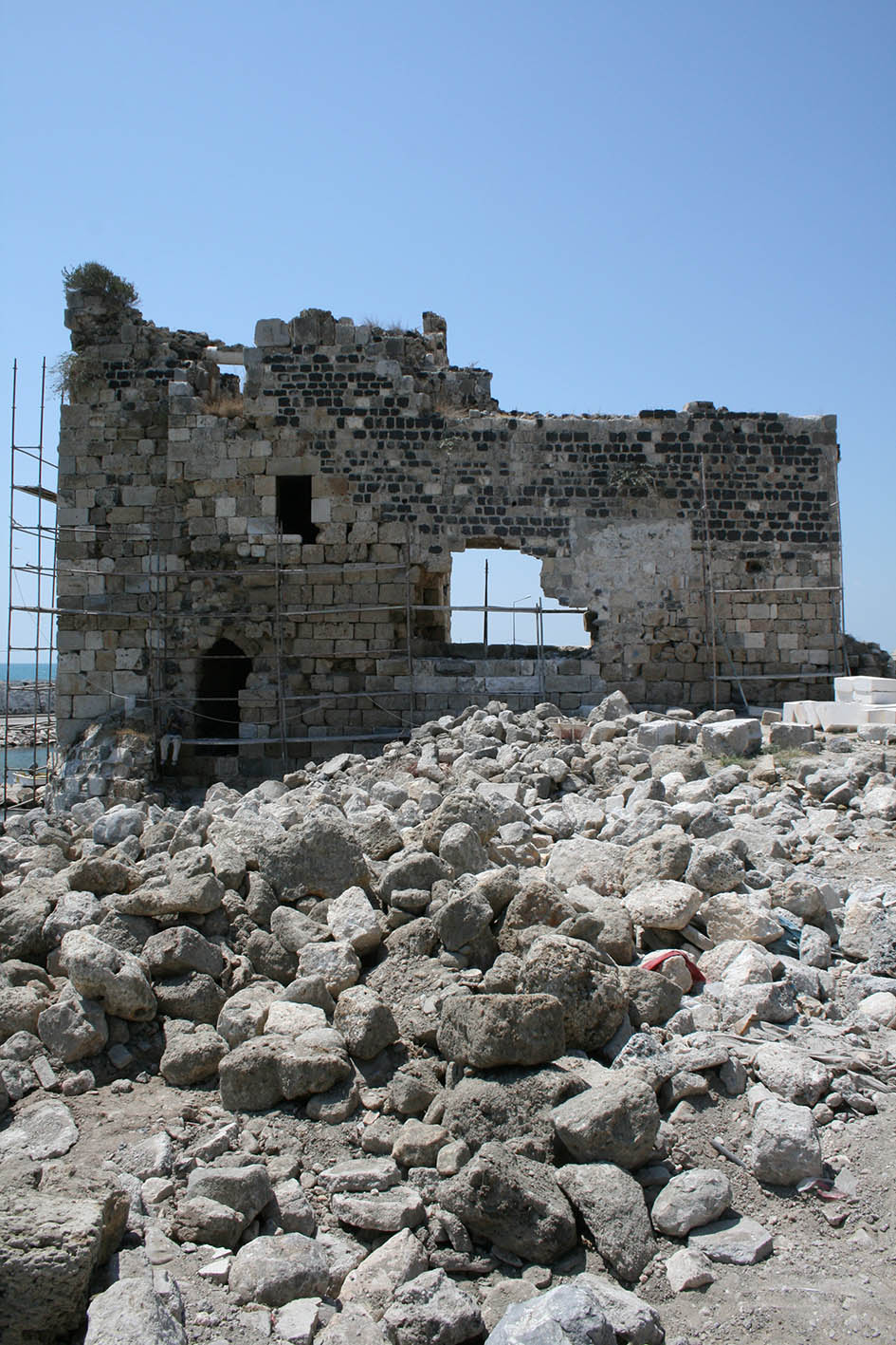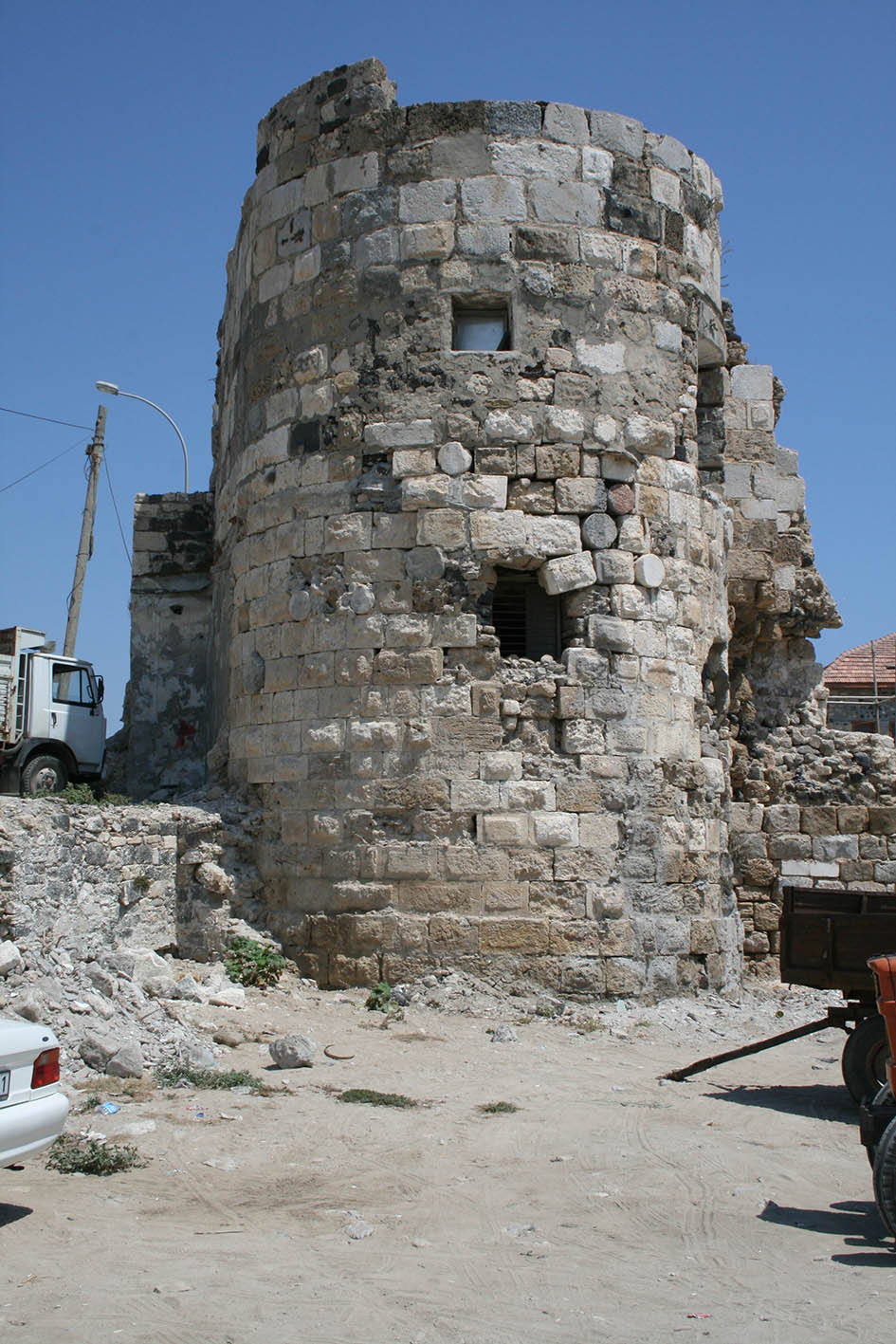 Le seul édifice que le temps ait respecté est le château et les appendices construits avec des pierres provenant des débris de la ville incendiée lors de la conquête. Ce château, qu’avait élevé les rois d’Arménie, a été bâti avec des pierres de taille entre lesquelles on a enchâssé symétriquement des fûts de colonnes provenant d’anciens édifices. Lors de la restauration de ce château par le sultan Soliman, qui avait compris de quelle importance était pour lui cette position avancée sur la côte de la Syrie, les ouvriers employèrent des pierres calcinées par le feu qu’ils ajustèrent de telle sorte dans les parties écroulées de l’édifice, qu’il semble affecter la figure d’un échiquier. Cette construction se compose de deux enceinte et d’un fossé. L’enceinte intérieure est la plus élevée ; elle est formée de murailles reliées par des tours rondes ; l’autre est en partie ruinée, et, dans plusieurs endroits, il n’en reste que les fondations. C’est sur la première de ces murailles que j’ai vu encastrées deux inscriptions grecques mutilées de l’époque romaine. Au pied de ce château et du côté de la mer, on voit quantité d’énormes boulets de pierre, provenant du dernier siège que la ville eut à soutenir contre les musulmans.