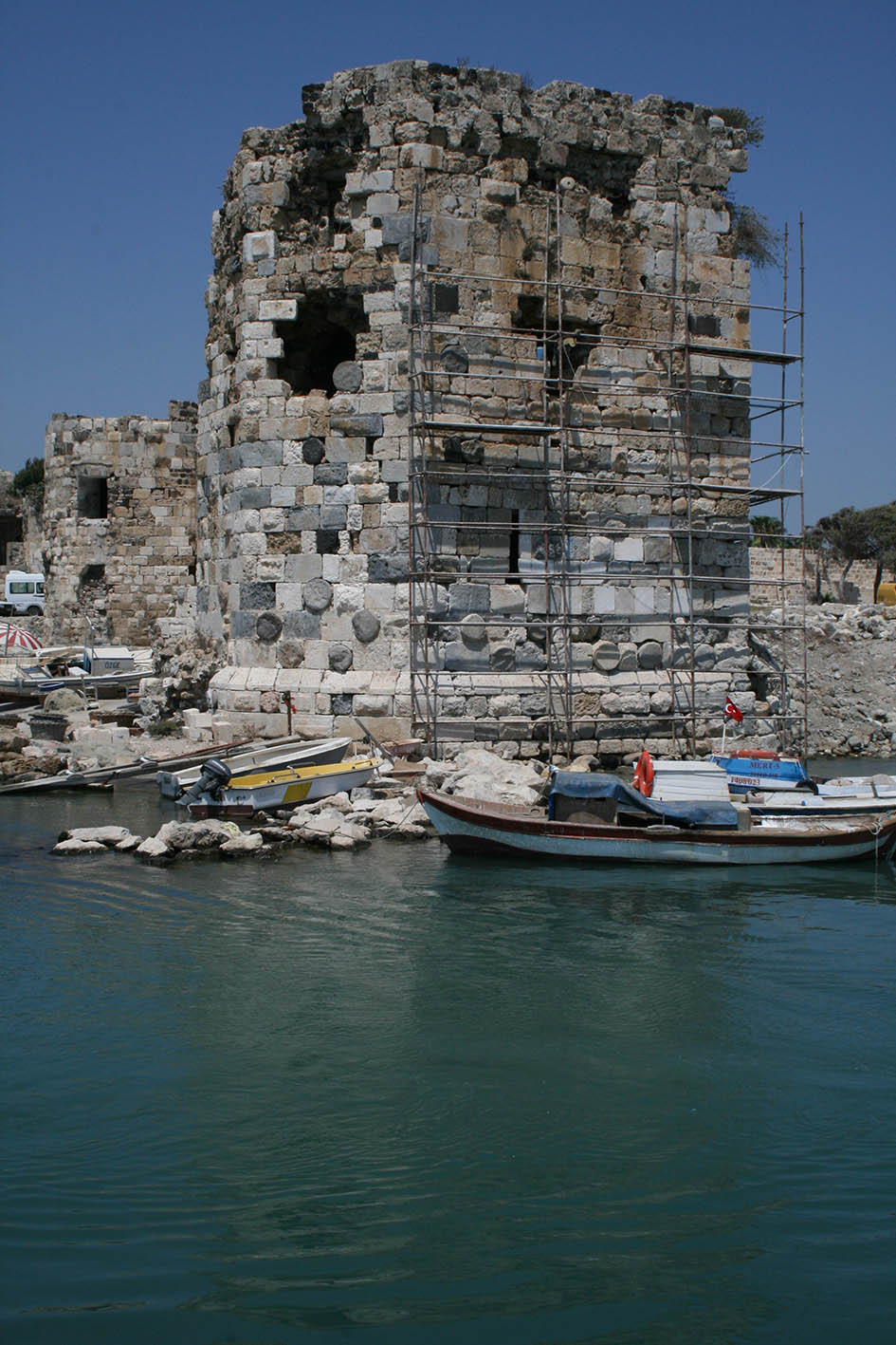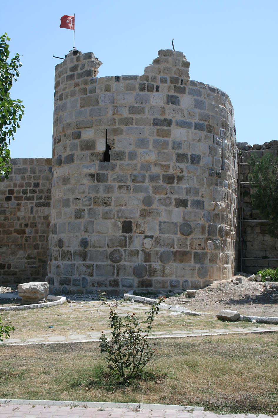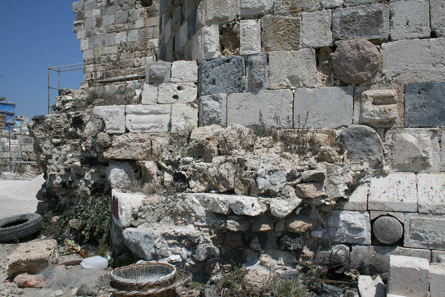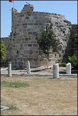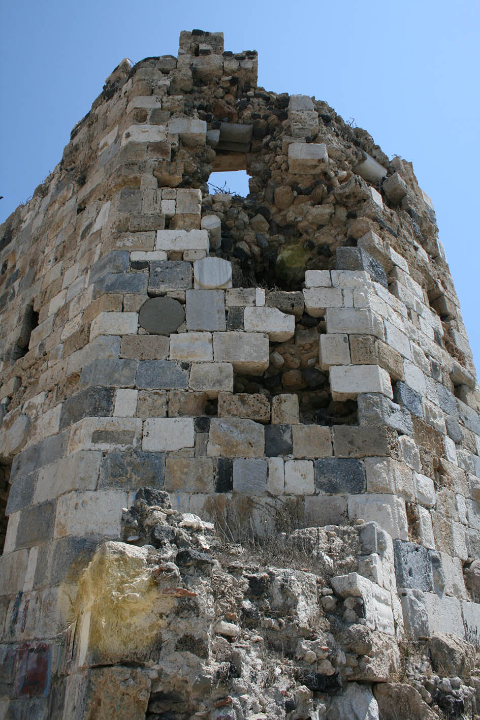 Le seul édifice que le temps ait respecté est le château et les appendices construits avec des pierres provenant des débris de la ville incendiée lors de la conquête. Ce château, qu’avait élevé les rois d’Arménie, a été bâti avec des pierres de taille entre lesquelles on a enchâssé symétriquement des fûts de colonnes provenant d’anciens édifices. Lors de la restauration de ce château par le sultan Soliman, qui avait compris de quelle importance était pour lui cette position avancée sur la côte de la Syrie, les ouvriers employèrent des pierres calcinées par le feu qu’ils ajustèrent de telle sorte dans les parties écroulées de l’édifice, qu’il semble affecter la figure d’un échiquier. Cette construction se compose de deux enceinte et d’un fossé. L’enceinte intérieure est la plus élevée ; elle est formée de murailles reliées par des tours rondes ; l’autre est en partie ruinée, et, dans plusieurs endroits, il n’en reste que les fondations. C’est sur la première de ces murailles que j’ai vu encastrées deux inscriptions grecques mutilées de l’époque romaine. Au pied de ce château et du côté de la mer, on voit quantité d’énormes boulets de pierre, provenant du dernier siège que la ville eut à soutenir contre les musulmans.
