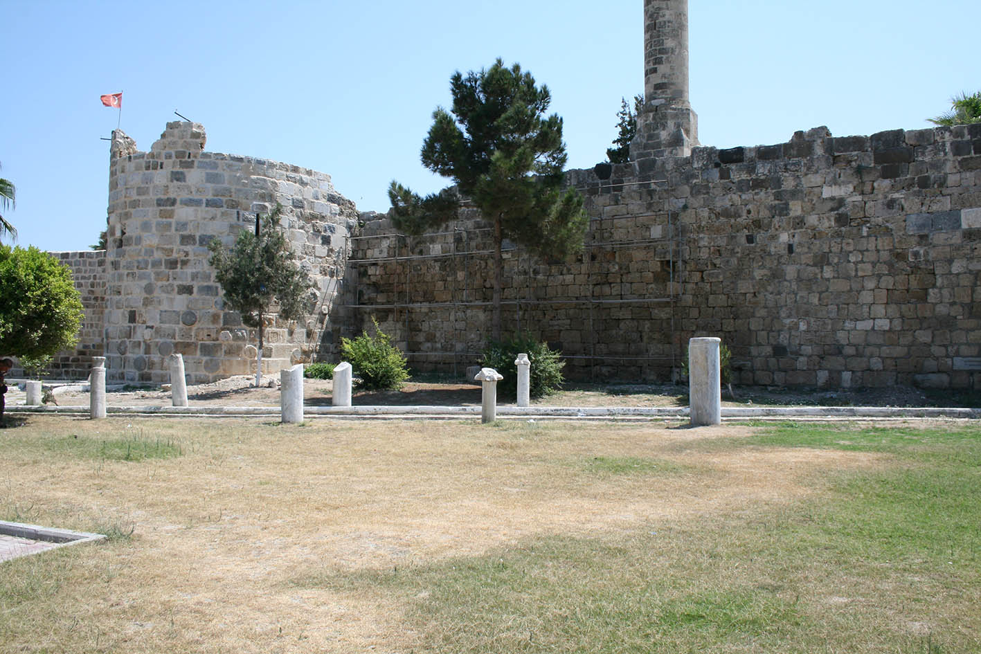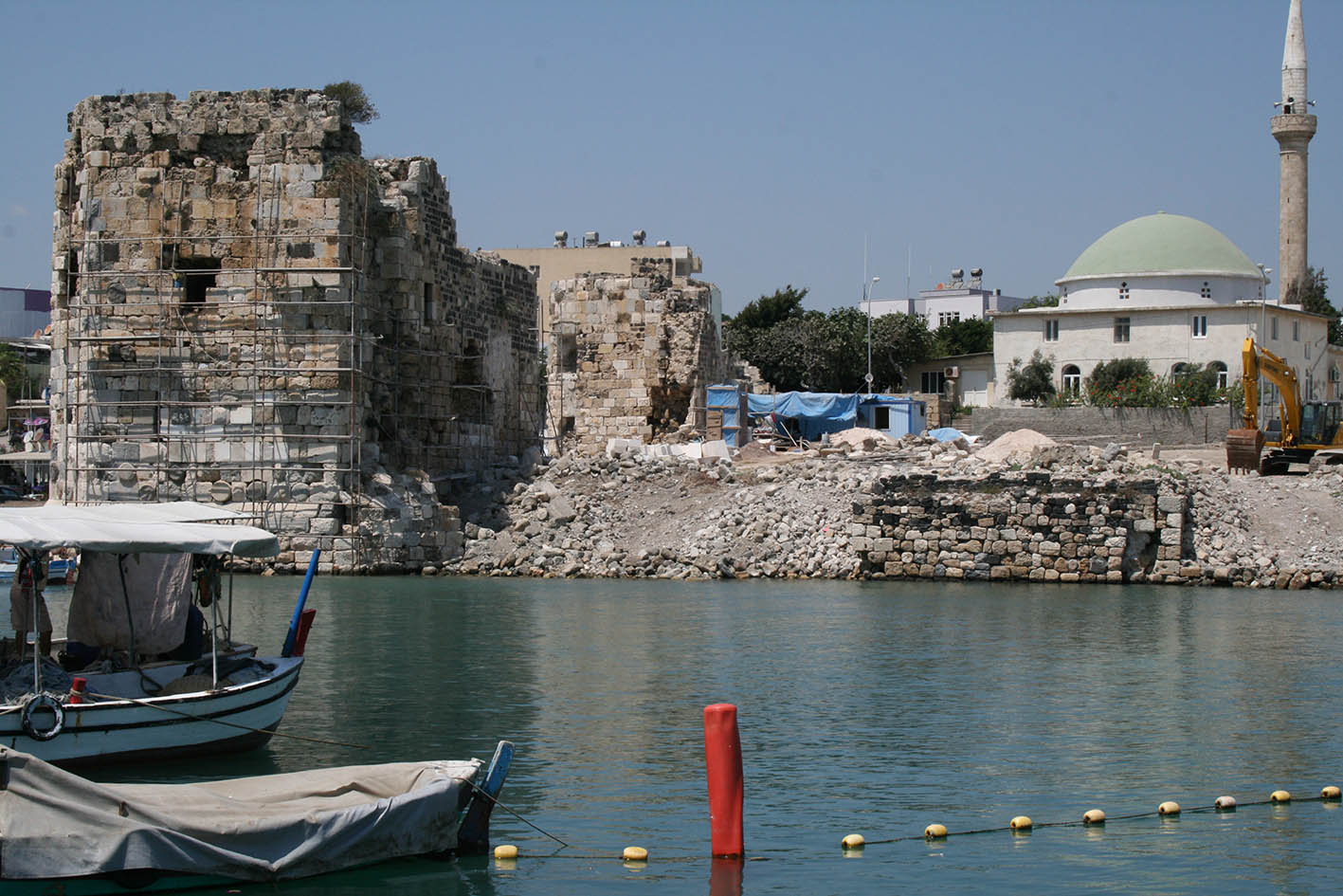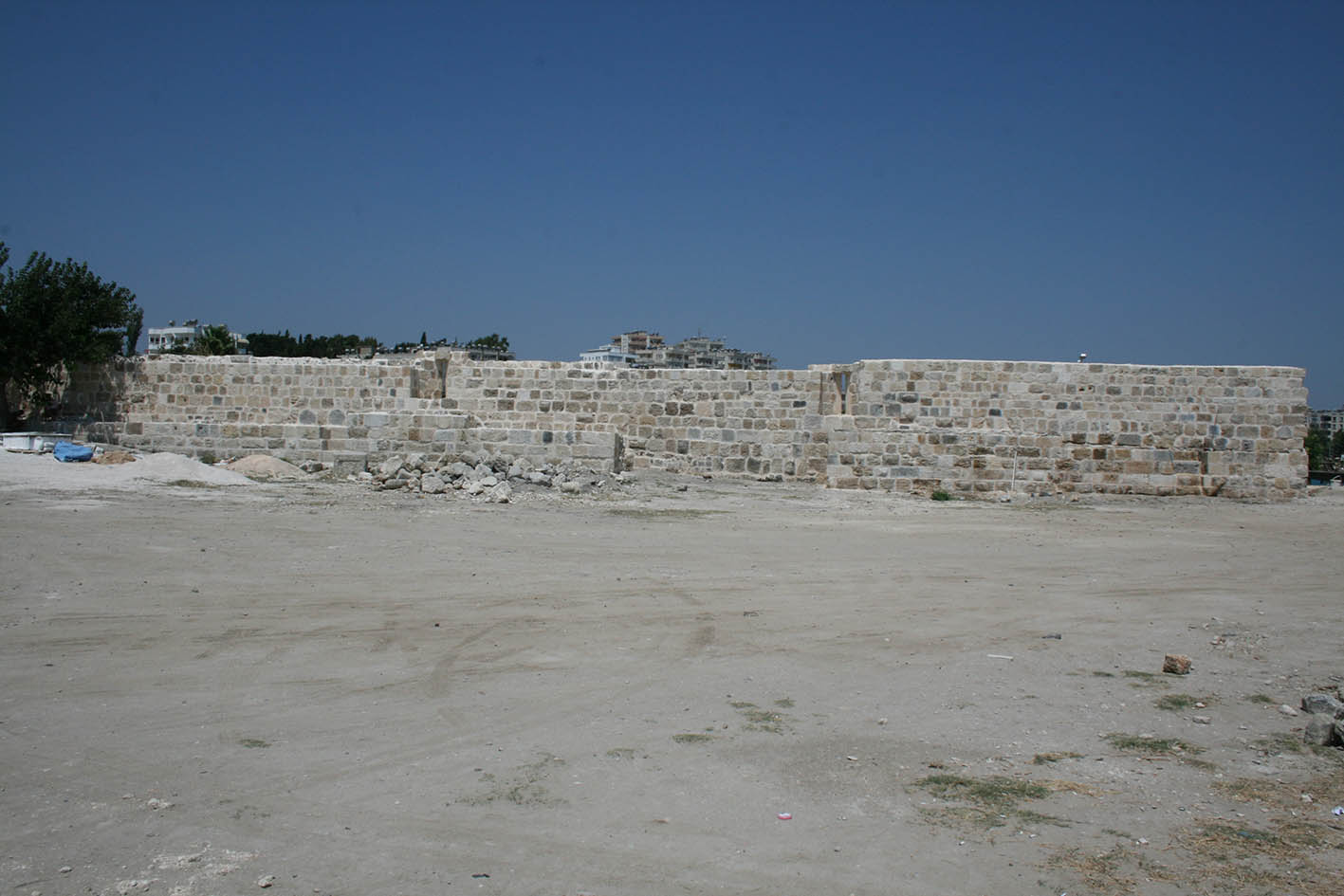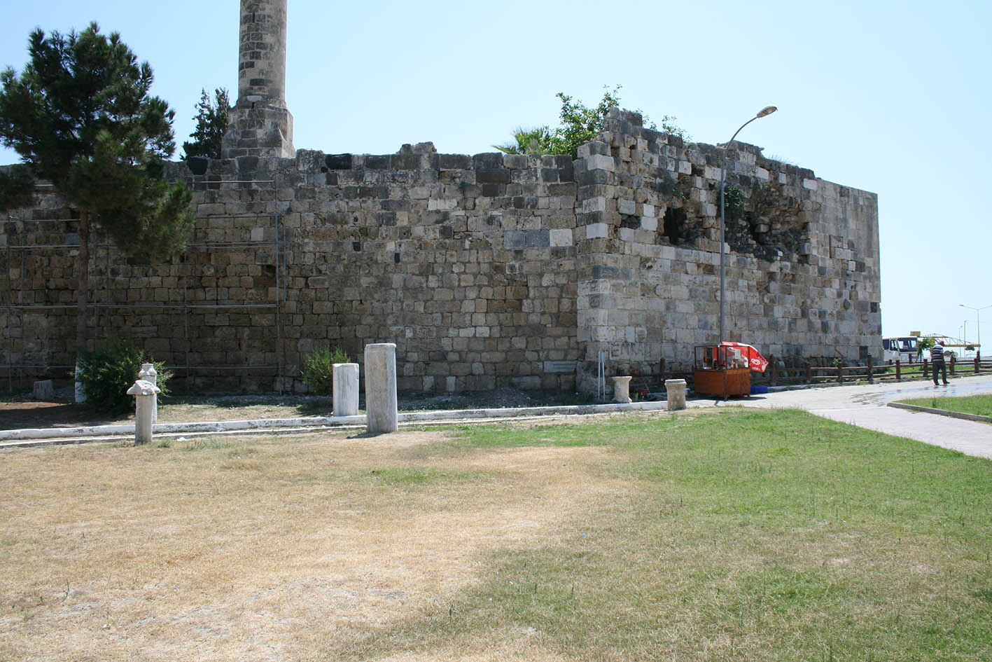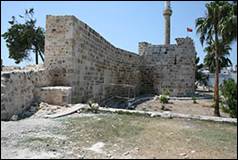 Le seul édifice que le temps ait respecté est le château et les appendices construits avec des pierres provenant des débris de la ville incendiée lors de la conquête. Ce château, qu’avait élevé les rois d’Arménie, a été bâti avec des pierres de taille entre lesquelles on a enchâssé symétriquement des fûts de colonnes provenant d’anciens édifices. Lors de la restauration de ce château par le sultan Soliman, qui avait compris de quelle importance était pour lui cette position avancée sur la côte de la Syrie, les ouvriers employèrent des pierres calcinées par le feu qu’ils ajustèrent de telle sorte dans les parties écroulées de l’édifice, qu’il semble affecter la figure d’un échiquier. Cette construction se compose de deux enceinte et d’un fossé. L’enceinte intérieure est la plus élevée ; elle est formée de murailles reliées par des tours rondes ; l’autre est en partie ruinée, et, dans plusieurs endroits, il n’en reste que les fondations. C’est sur la première de ces murailles que j’ai vu encastrées deux inscriptions grecques mutilées de l’époque romaine. Au pied de ce château et du côté de la mer, on voit quantité d’énormes boulets de pierre, provenant du dernier siège que la ville eut à soutenir contre les musulmans.