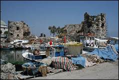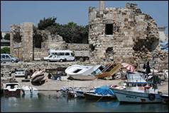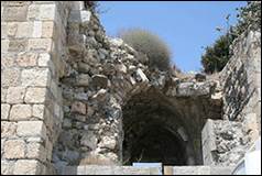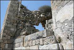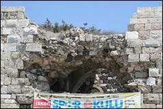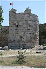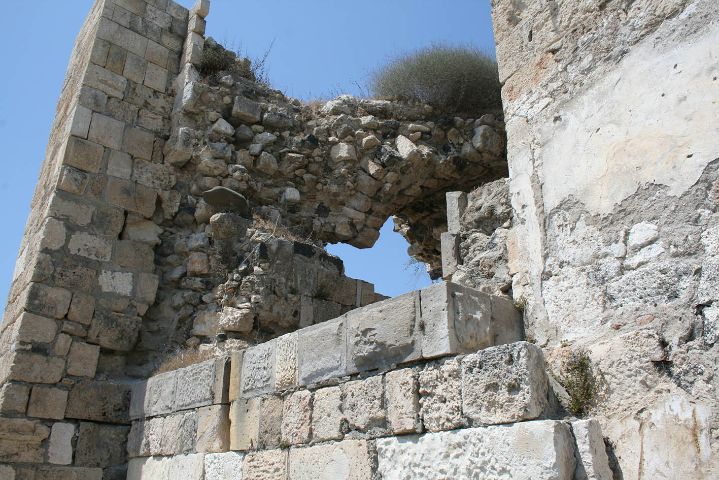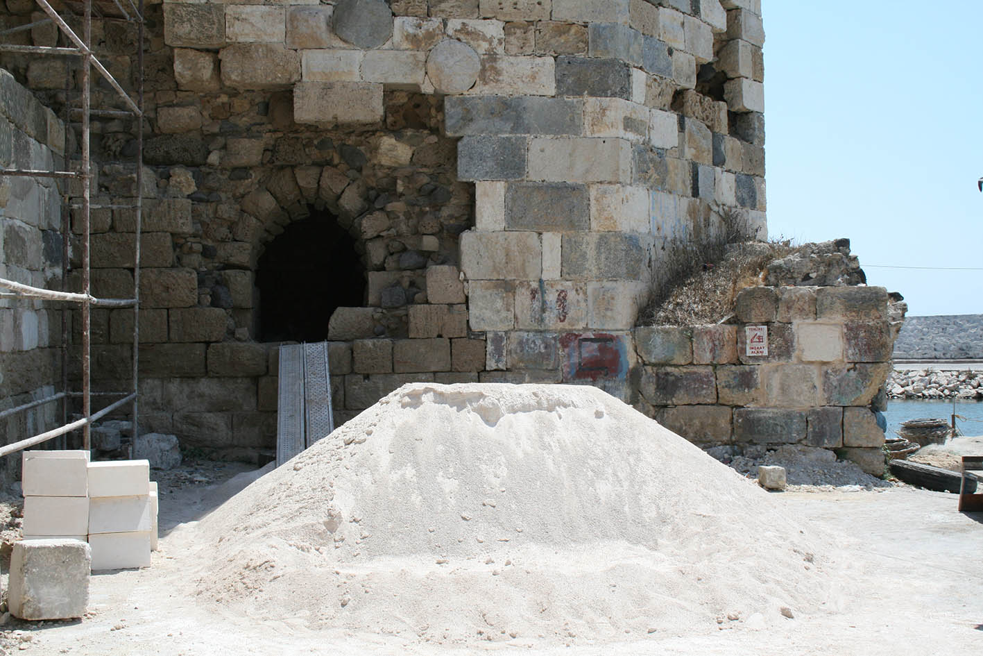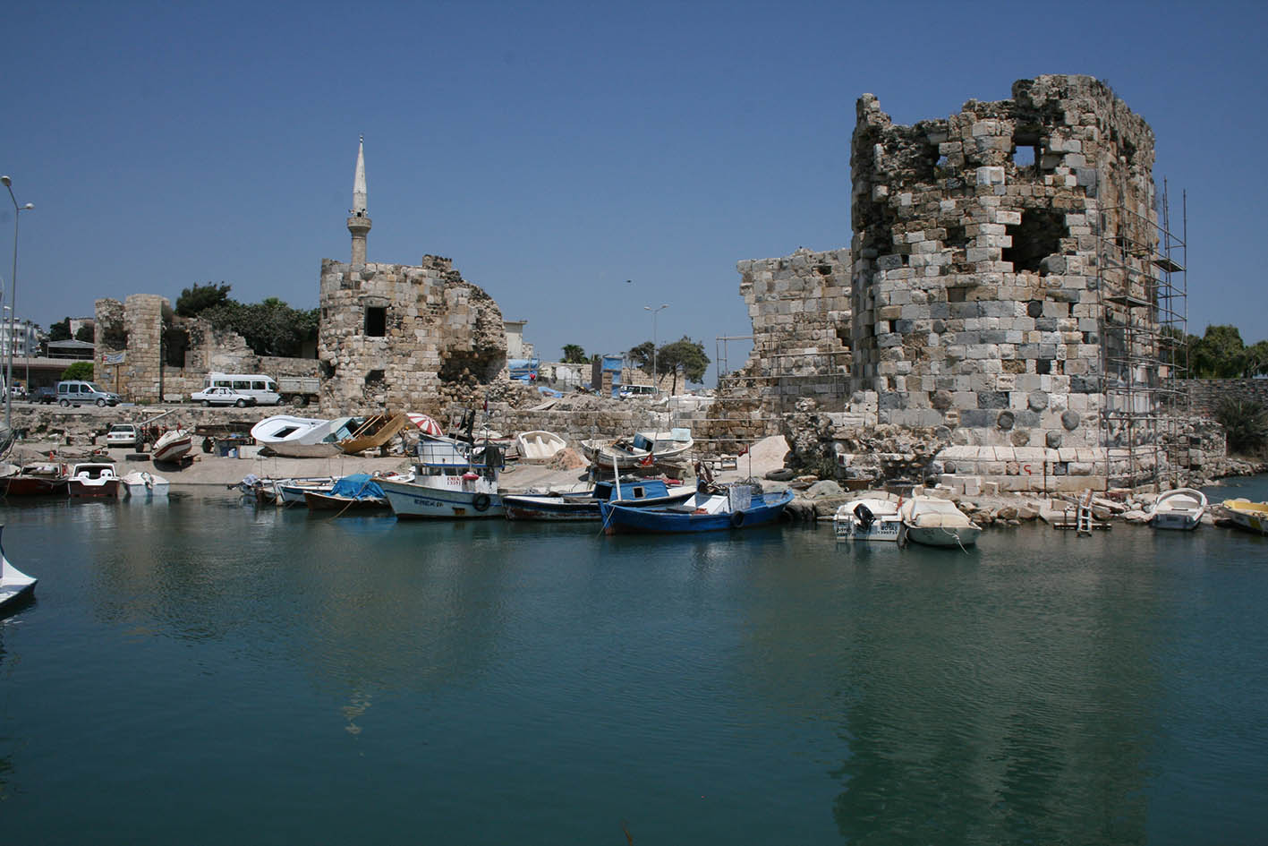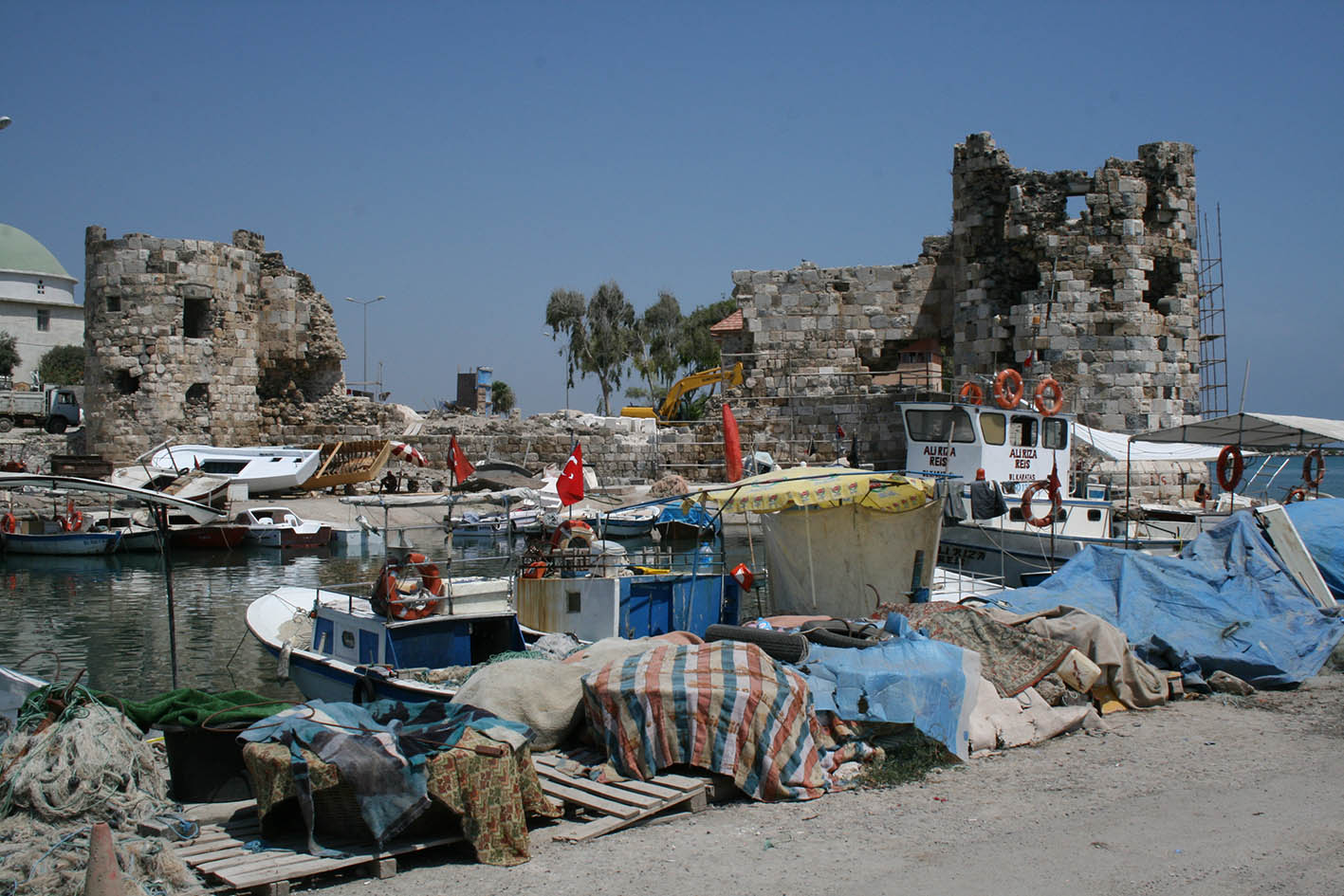 Le seul édifice que le temps ait respecté est le château et les appendices construits avec des pierres provenant des débris de la ville incendiée lors de la conquête. Ce château, qu’avait élevé les rois d’Arménie, a été bâti avec des pierres de taille entre lesquelles on a enchâssé symétriquement des fûts de colonnes provenant d’anciens édifices. Lors de la restauration de ce château par le sultan Soliman, qui avait compris de quelle importance était pour lui cette position avancée sur la côte de la Syrie, les ouvriers employèrent des pierres calcinées par le feu qu’ils ajustèrent de telle sorte dans les parties écroulées de l’édifice, qu’il semble affecter la figure d’un échiquier. Cette construction se compose de deux enceinte et d’un fossé. L’enceinte intérieure est la plus élevée ; elle est formée de murailles reliées par des tours rondes ; l’autre est en partie ruinée, et, dans plusieurs endroits, il n’en reste que les fondations. C’est sur la première de ces murailles que j’ai vu encastrées deux inscriptions grecques mutilées de l’époque romaine. Au pied de ce château et du côté de la mer, on voit quantité d’énormes boulets de pierre, provenant du dernier siège que la ville eut à soutenir contre les musulmans.