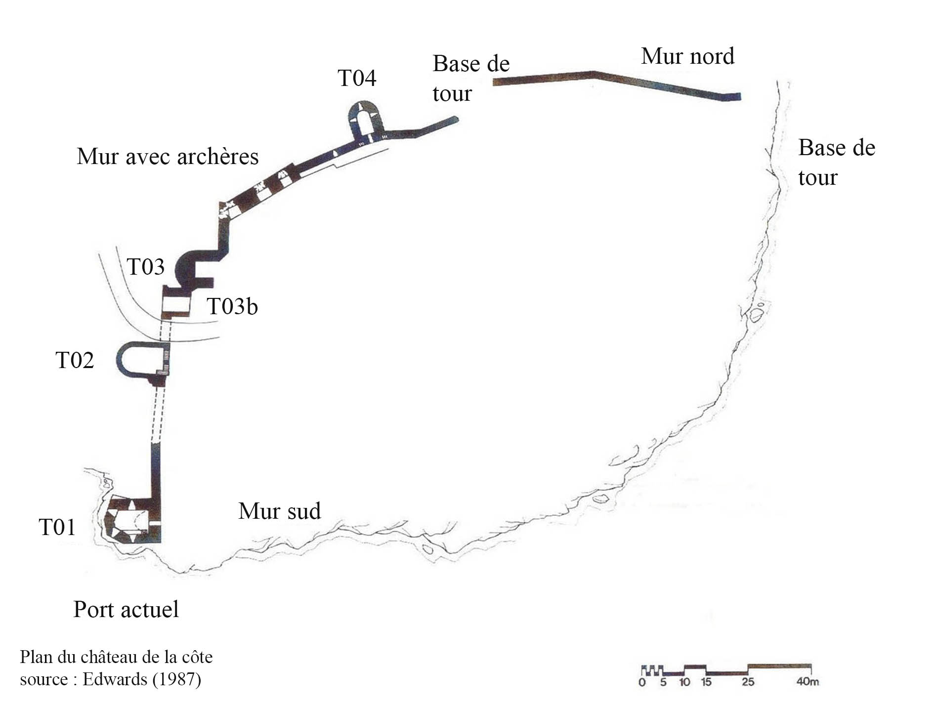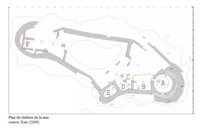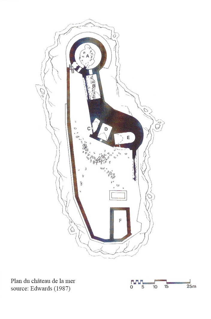 A 400m du rivage, le Château de la Mer, consiste en un long rempart avec cinq tours (ill.44, 45). Il serait postérieur au Château de la Côte (ill.46-48).