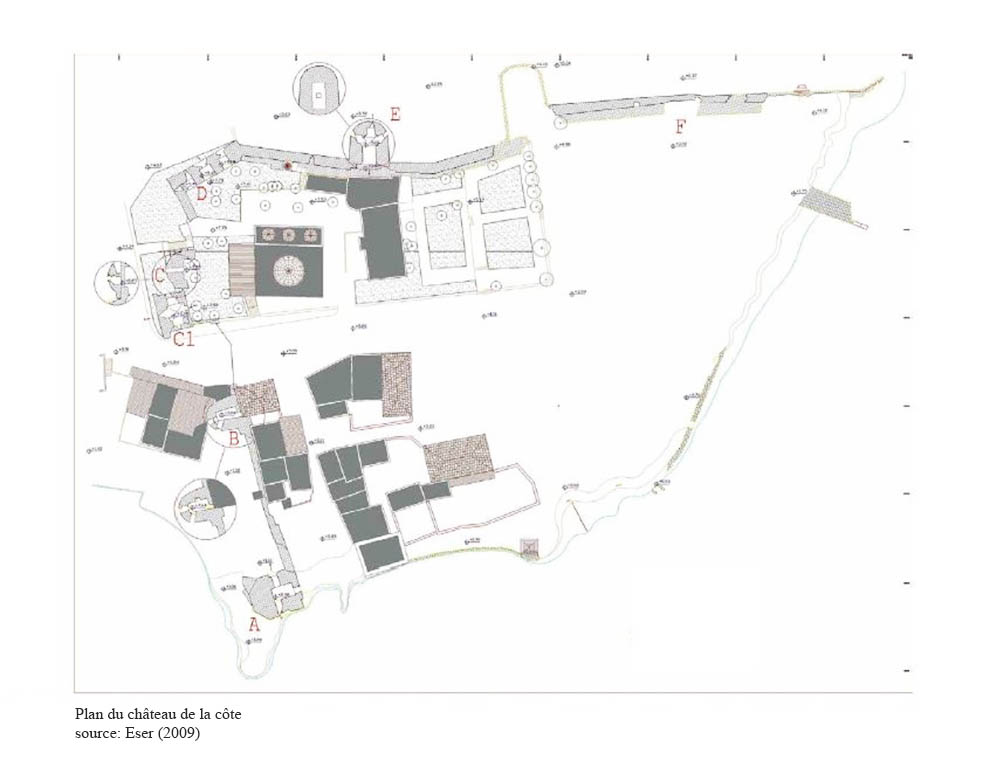 De nos jours, le Château de la Côte n’a conservé qu’une partie de ses murs et quelques tours en élévation. Au nord et sur le rivage on trouve des bases de tours, ainsi que des pans de maçonnerie au sud (ill.1-3).