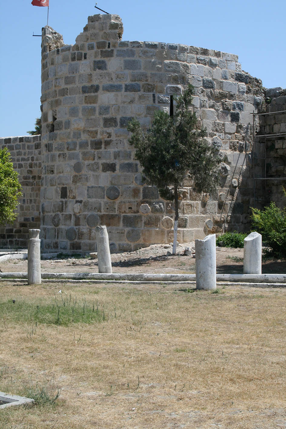 [5] On trouve de nombreux éléments antiques disséminés dans toute la ville, ils ont servi de matériaux de remploi, notamment pour la tour isolée polygonale à l’ouest du château.